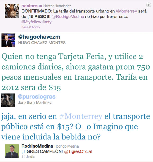 El día de ayer #Monterrey y "Tarjeta Feria" estaban en los temas más comentados de Twitter. El congreso estatal aprobó el aumento tarifario en el transporte público con lo que se elevó el costó hasta 15 pesos por pasaje. Los tuiteros neoleoneneses de inmediato manifestaron su inconformidad y pidieron respuestas a Rodrigo Medina. Sin embargo, en su cuenta @RodrigoMedina el gobernador sólo se dedicó a escribir logros y, por supuesto, a festejar el triunfo de su equipo de futbol.