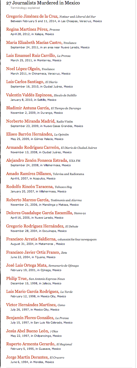 Además agregó que "el malogrado proceso judicial en el caso de Regina Martínez Pérez y el sobreseimiento de los cargos contra uno de los pistoleros implicados en el atentado contra J. Jesús Blancornelas, director del semanario Zeta,contribuyeron a intensificar las preocupaciones en el sentido de que el gobierno del presidente Enrique Peña Nieto no tiene la capacidad de enfrentar el desafío de acabar con el ciclo de impunidad y violencia de México".