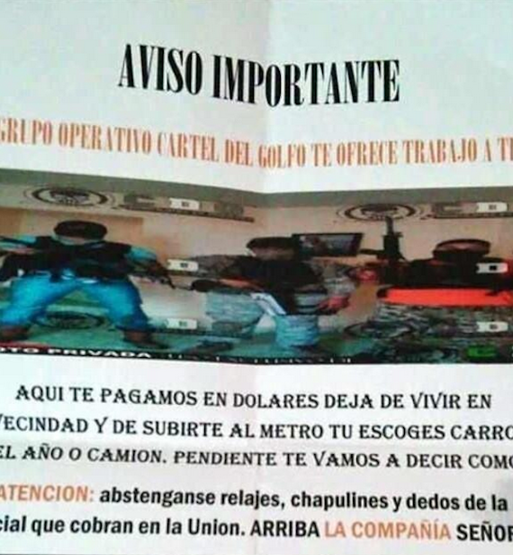 "Aviso importante: grupo operativo Cártel del Golfo te ofrece trabajo a ti. Aquí te pagamos en dólares, deja de vivir en vecindad y subirte al Metro; tú escoges, carro del año o camión, pendiente, te vamos a decir cómo", dice el volante que incluye una fotografía de tres hombres armados y encapuchados.