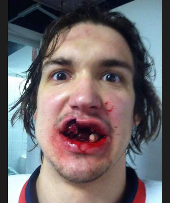 Esta foto te revolverá el estómago, pero ver esta otra foto de cuando el jugador de hockey todavía tenía sus dientes hace que la imagen sea aún más horripilante.