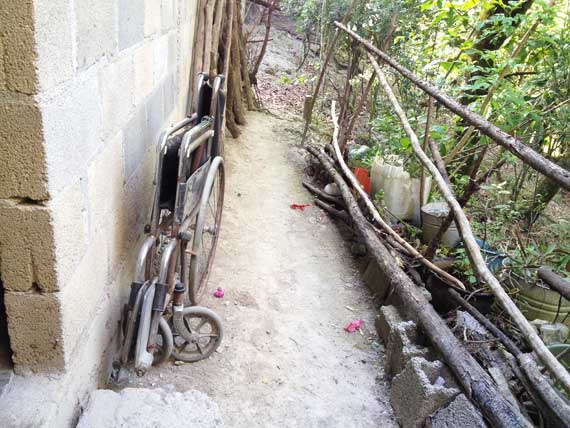 Afuera de su casa en la comunidad Texquitote II, en el municipio de Matlapa, está una lámina plateada con la leyenda: “Piso Firme. Programa Federal. Vivir Mejor”, creado en 2000 por el ex Presidente Vicente Fox Quesada. En un día le cambiaron su piso de tierra por  concreto. Cumplieron con la estadística, la tierra quedó atrás, pero no hicieron lo esencial: arreglar la entrada de la casa de Juan. Él sin poder caminar, para bajar y subir depende de la espalda de su mamá. Empinada, en subida, la entrada es el primer obstáculo.