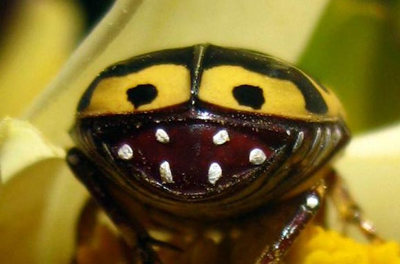 4. Los escarabajos puede tener colores vibrantes que ahuyentan a sus enemigos. En este caso despliegan grandes ojos y la boca llena de dientes afilados.