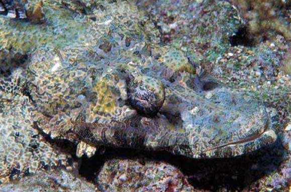 7. Otros animales marinos adoptan el color y la apariencia del fondo del océano. Muchas especies de peces pasan la mayor parte de su vida en cerca de la arena para protegerse. El pez de la fotografía sería difícil de notar, porque su color y forma se asemeja a las rocas.