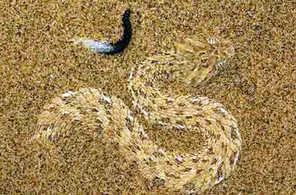 9. Un mimetismo que es peligroso es el de reptiles como las serpientes, que camuflajean fácilmente su color y cuerpo delgado. Las serpientes con frecuencia puede confundirse con ramas, piedras y también con arena y grava. Puede ser muy peligroso para otros animales e incluso el ser humano.