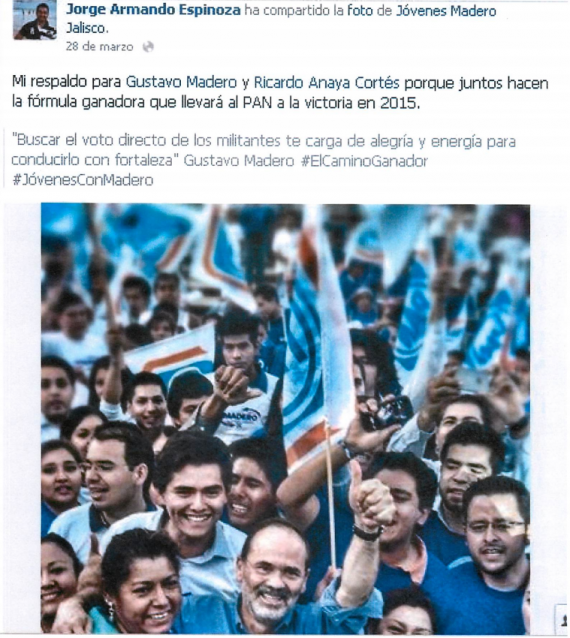 “Hoy al frente del PAN y al frente de los proyectos importantes del PAN en Jalisco se encuentran quienes llevaron al partido al tercer lugar en el proceso del 2012 [luego de que el partido había gobernador la entidad por 18 años], personas que son quienes coordinan la campaña de Gustavo Madero y que a través de campañas se les ha estado premiando no sólo en esa lógica de tercer lugar, sino también con conductas antidemocráticas con motivo de apoyar a costa de lo que sea a Madero”, aseguró el Vicecoordinador de los Senadores panistas, José María Martínez Martínez, quien ocupa un escaño por Jalisco.