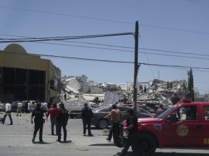 REYNOSA, TAMAULIPAS, 15MAYO2014.- Dos muertos y al menos 17 heridos y pánico en la ciudad es el saldo de una explosión en un centro comercial en la colonia Colina del Pedregal al sur de Reynosa, Tamaulipas. De acuerdo a los informes, la acumulación de gas en el inmueble que alberga un restaurante de comida china, un despacho y una mueblería, al parecer fue lo que causó que se desplomara tras la explosión que cimbró unos 300 metros a la redonda del lugar. Tras los efectos de la exploisión, se contabilizan 18 vehículos que estaban estacionados cerca de la mueblería Marcotem y Ramsa. El área del accidente está resguardada por elementos de la Secretaría de Marina Armada de México (Semar), Secretaría de la Defensa Nacional (Sedena), Policía Federal y Elementos de Protección Civil.