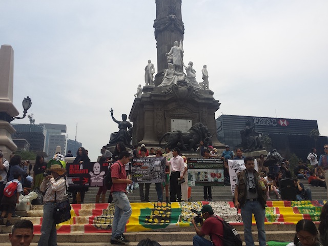 Al momento, los manifestantes, que portan pancartas en defensa del maíz mexicano, hicieron una pausa en el cruce con avenida Insurgentes, para ahí hacer un mitin.