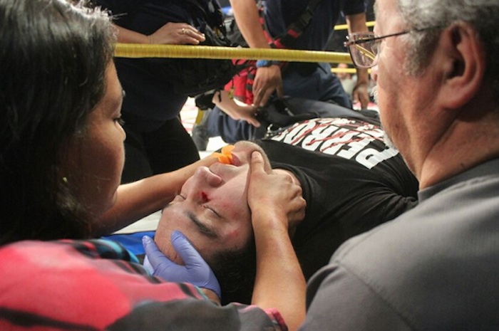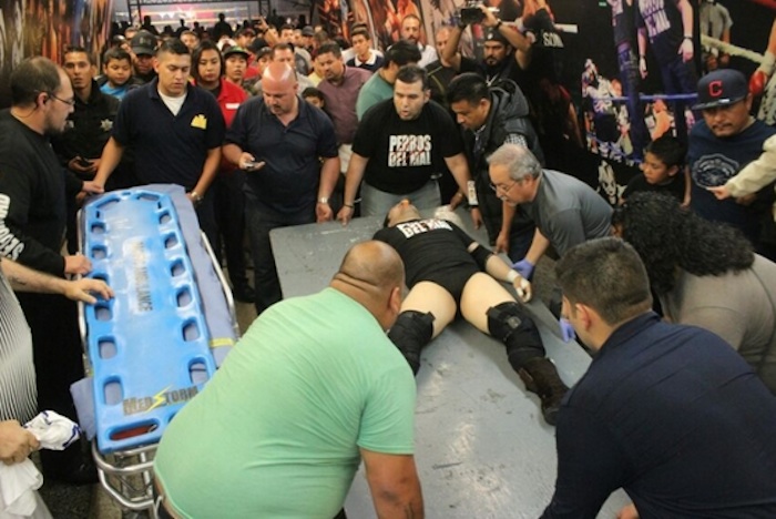 Ayer por la noche, inconsciente, el "Hijo del Perro Aguayo" fue trasladado de emergencia al Hospital del Prado, localizado a unos cuantos metros del auditorio municipal. El deportista perdió el sentido al tratar de esquivar un castigo del "Rey Misterio Junior", lo que causó asombro entre los cientos de espectadores que disfrutaban la función.