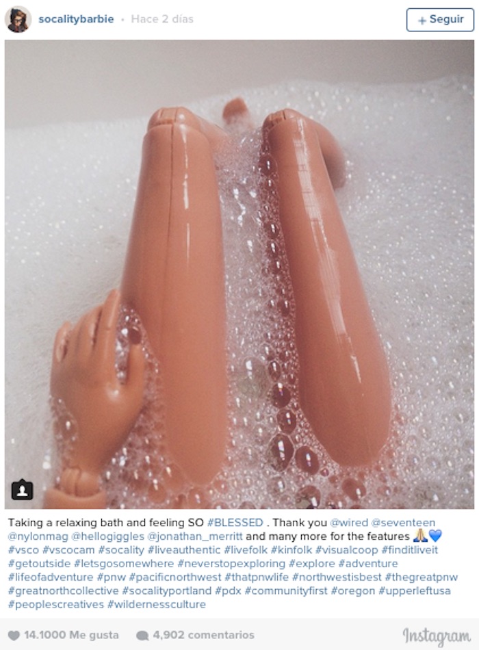 "Creé  Socalitybarbie, solamente para mi disfrute y el de mis amigos. Era una manera alegre y divertida de burlarse de todas las personas que utilizan Instagram y hashtags como '#LiveAuthentic'. Pensé que usar una muñeca de producción masiva sería la mejor manera de hacer ver las contradicciones", señala la fotógrafa.