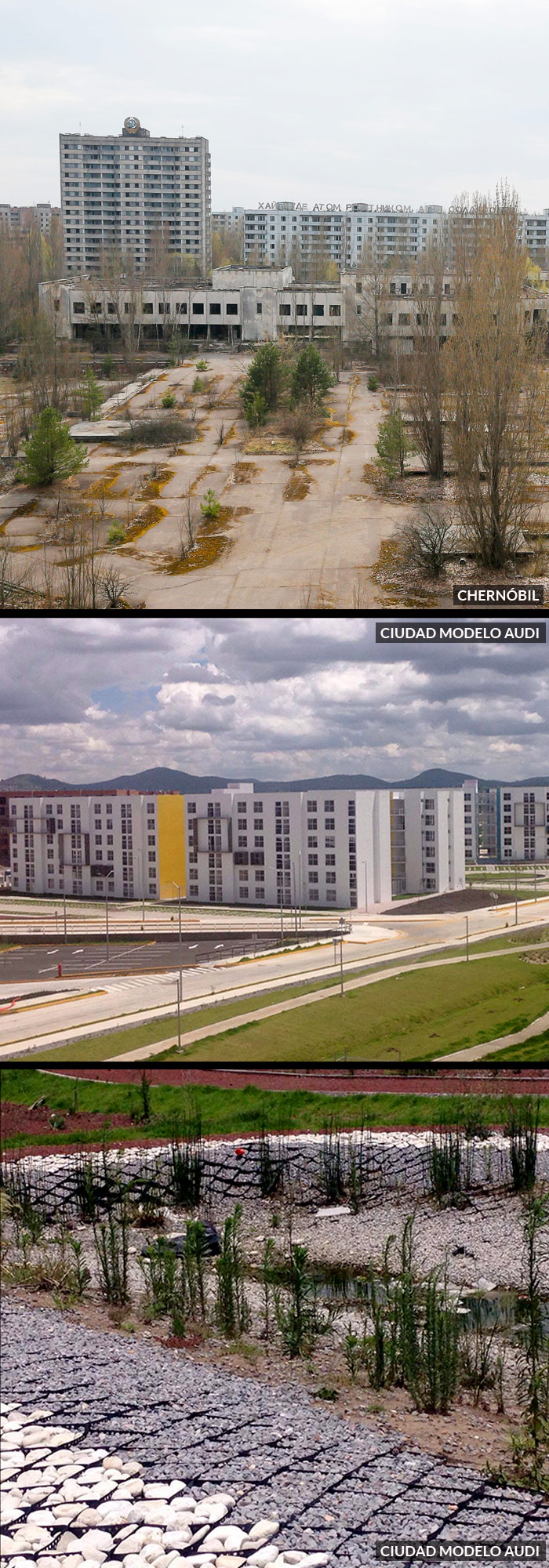 Ciudad Modelo Audi luce como la ciudad de Chernóbil, al norte de Ucrania. Con la diferencia que Chernóbil está habitada por cerca de 704 individuos, y tiene una cierta vida aunque el tiempo y la falta de mantenimiento la han convertido en un símbolo postmoderno del desastroso paso del hombre por la tierra.