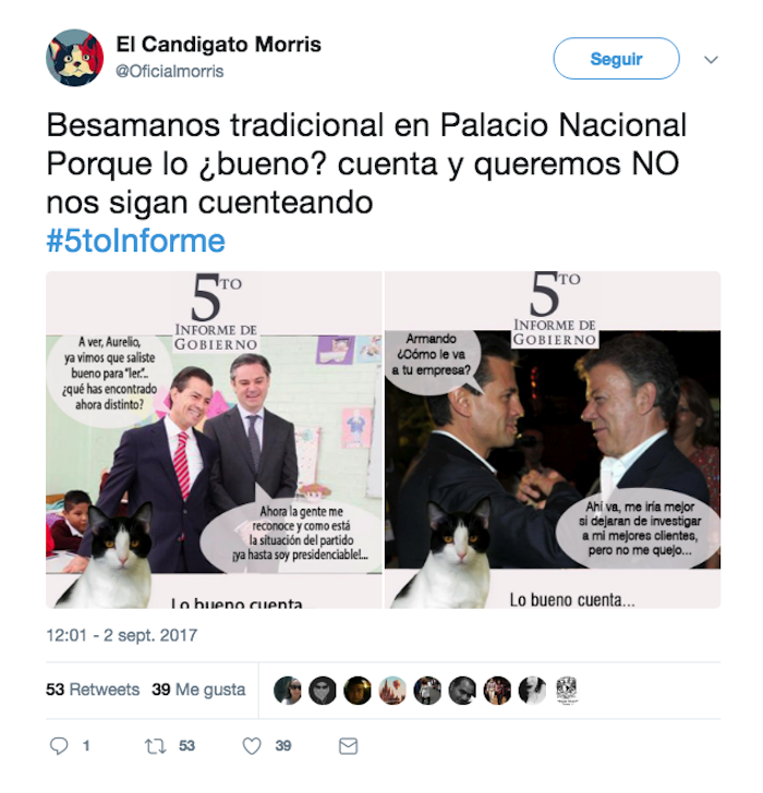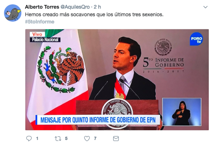 Con los hashtags #LoBuenoCuenta y #5toInforme, la administración de Peña Nieto difundió a través de Twitter, de Facebook y de Youtube fragmentos del discurso del Presidente. Sin embargo, estos mismos fueron utilizados por los usuarios de Twitter para compartir decenas de memes que le ganaron a los bots y a los Trending Topics promovidos por el Gobierno federal.