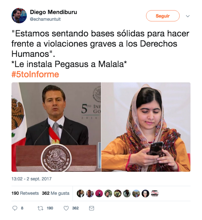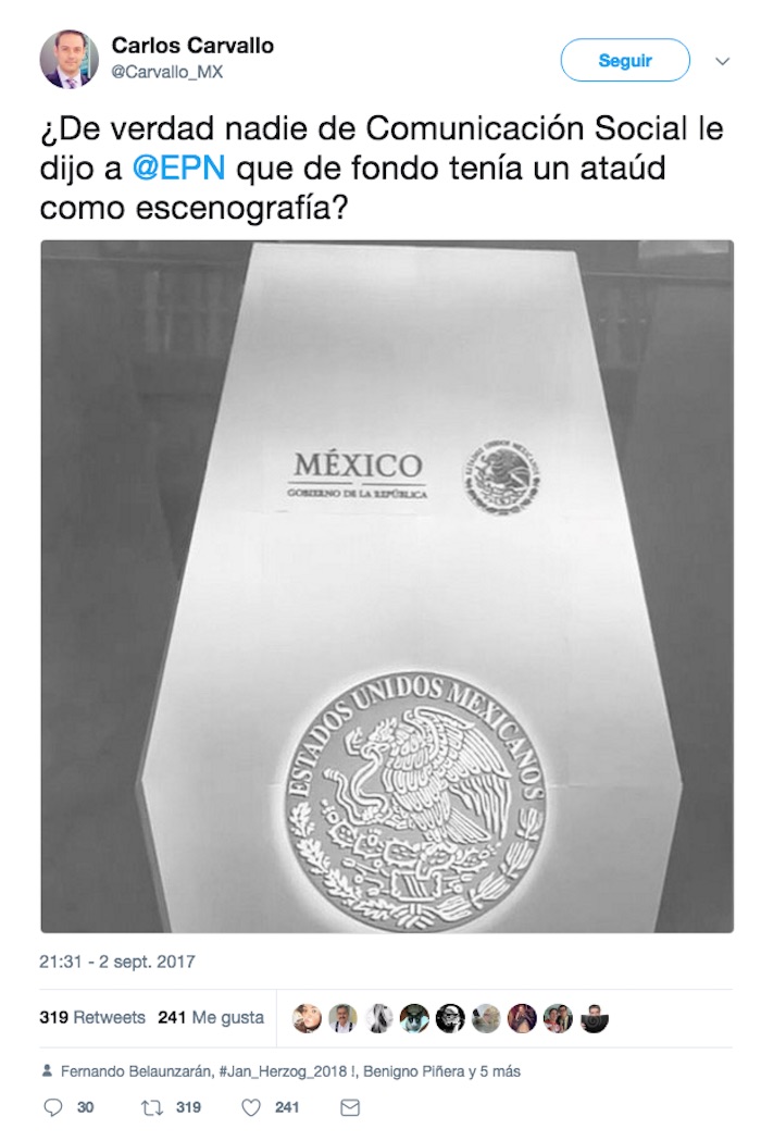 El activista y director de cine, Epigmenio Ibarra, compartió una imagen del Presidente sonriendo durante su Quinto Informe acompañada de la frase: “¿De qué se ríe? El mismo de Atenco, Ayotzinapa, Tanhuato, Apatizingan, Tlatlaya. El de la ‘casa blanca’ se ríe de nosotros”.