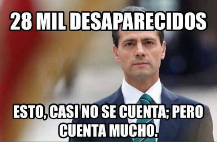 En el tema de los desaparecidos,  que suman más de 30 mil, de acuerdo con cifras oficiales, fue uno de los más comentados en Twiter. Una fotografía con el rostro serio de Enrique Peña Nieto y la leyenda de “28 mil desparecidos. Esto, casi no cuenta, pero cuenta mucho”, se compartió cientos de veces.