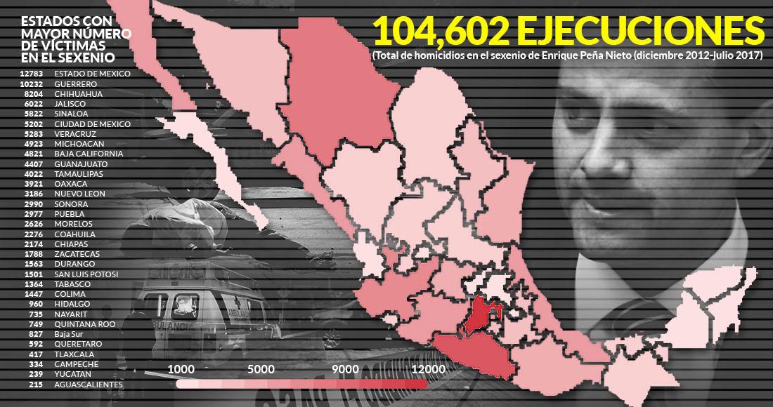 El semanario Zeta, el único medio de información en México que mantiene una contabilidad verificada sobre los asesinatos en el país, reporta que, del 1 de diciembre de 2012 –cuando Peña tomó posesión de la Presidencia– al 31 de julio de 2017, se cometieron 104 mil 602 homicidios dolosos.