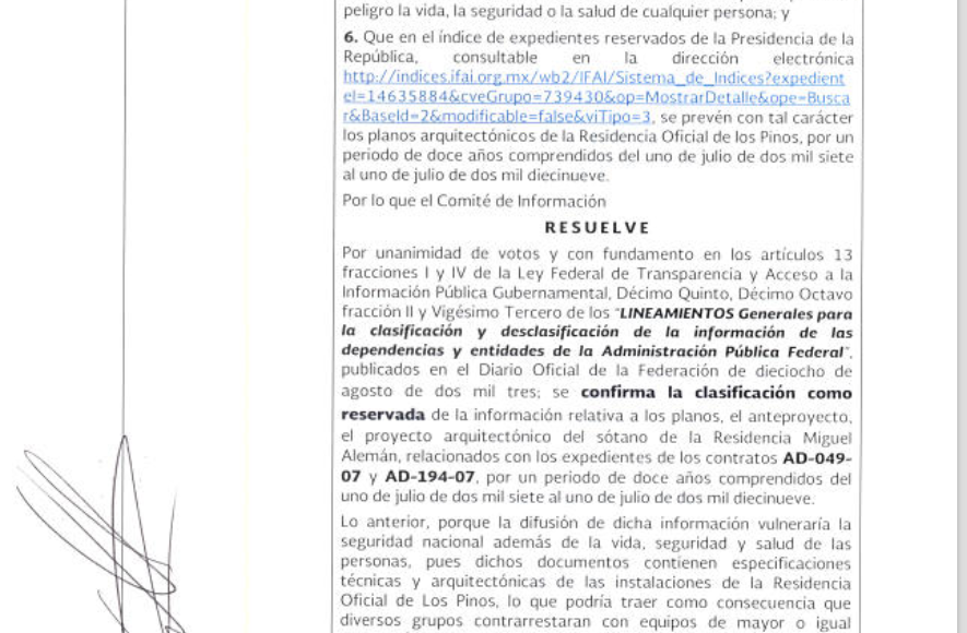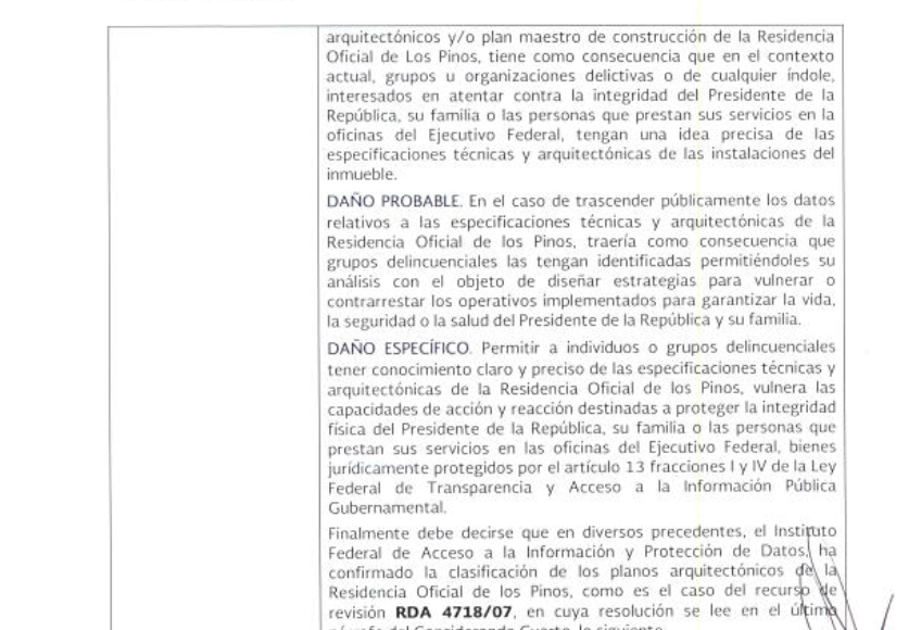 Además, el Comité de Información de la Presidencia expuso que si esa información era difundida, se generaría la posibilidad de acceder a la Residencia Oficial de Los Pinos y de manera específica se podría atentar contra la vida del Presidente, su familia o las personas que prestan sus servicios en las oficinas del Ejecutivo federal.