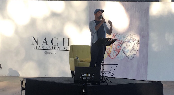 Lejos del protocolo formal de las presentaciones de libros en la feria, que termina este domingo, "Nach" (Alicante, 1974) hizo suyo el sencillo auditorio de concreto, techo de lámina y paredes recién pintadas de blanco y a decenas de fanáticos de todas las edades que se dejaron llevar por sus rimas sin música de fondo.