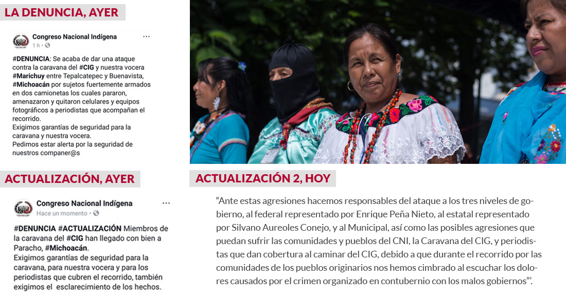 En un acto celebrado en el Hemiciclo a Juárez, en el céntrico parque de La Alameda, Marichuy condenó el asalto del pasado lunes a tres periodistas y dos activistas que viajaban en la caravana de la candidata en el suroccidental estado de Michoacán.