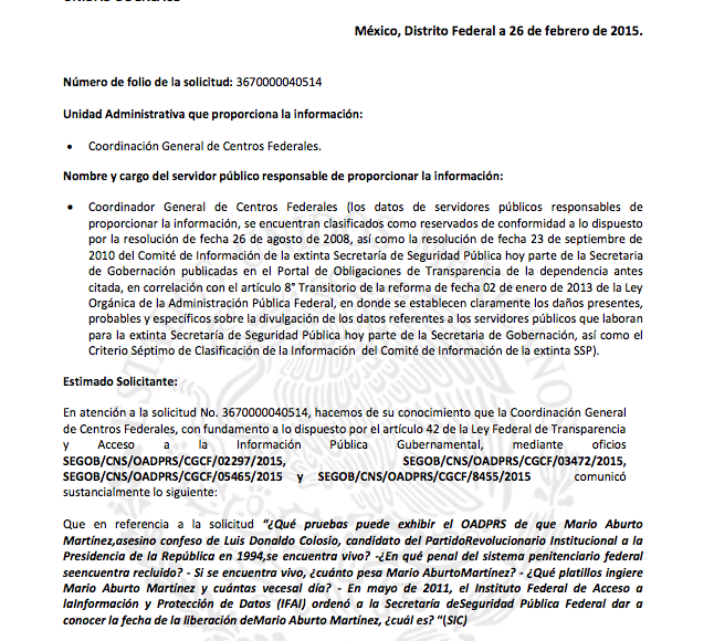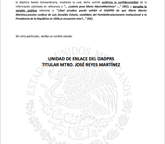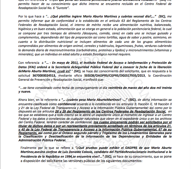 Eso respondió a SinEmbargo, el Órgano Administrativo Desconcentrado de Prevención y Readaptación Social de la Comisión Nacional de Seguridad cuando se le preguntó a través de Transparencia cuál era el peso físico del reo y si sería indultado. Lo que se deseaba era saber si Aburto estaba vivo. “A todo interno se le abrirá un expediente único al momento de ingresar a un Centro Federal y los datos o constancias de cualquier naturaleza que obren en el expediente único o en los archivos del Centro Federal, tendrán carácter de confidencial”. Además: “(esos datos y constancias) únicamente podrán ser solicitados por el titular de dichos datos o por un representante previamente acreditado”, argumentó.