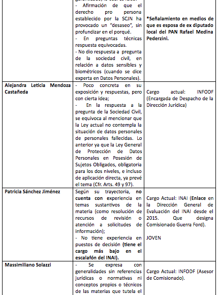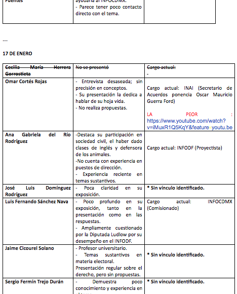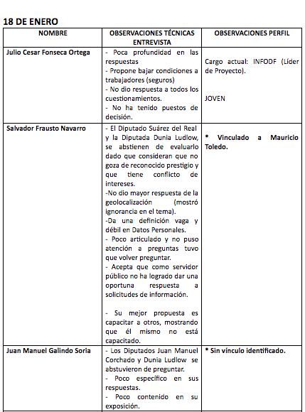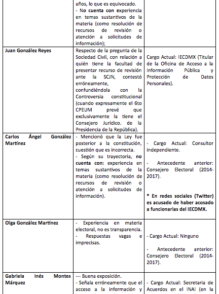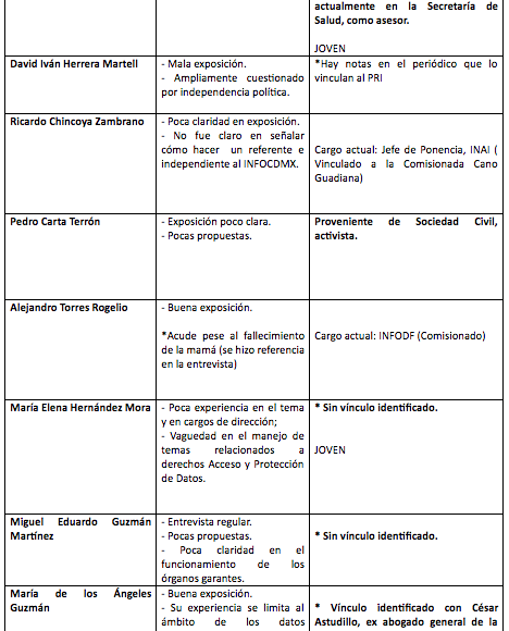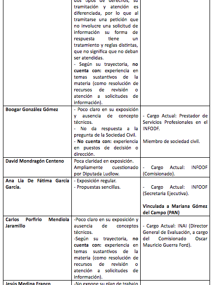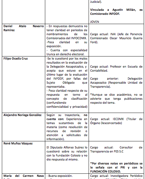 Dos: Muchos de los candidatos -67 en total-, incluidos seis de siete que podrían ocupar un cargo en el InfoDF, más que caracterizarse por su adecuado perfil, son característicos por sus vínculos políticos –presuntos “padrinazgos”–.