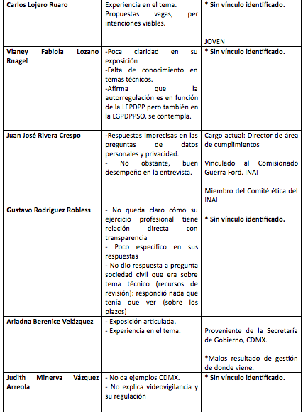 Según la mencionada lista, los aspirantes idóneos son Alejandro Torres Rogelio (actual comisionado), Francisco Varela Sandoval, Judith Minerva Vázquez Arreola, María del Carmen Nava Polina, María de los Ángeles Estrada González y Oscar Jovanny Zavala Gamboa.
