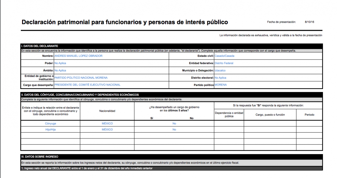 De la declaración 3de3 de AMLO que presentó en agosto de 2017, surge un “no” para casi todo: no hay cuenta de cheques, no hay tarjeta de crédito, no hay regalías por conferencias ni libros. También se encuentra el vacío. Los renglones para llenar “Bienes inmuebles del declarante”, “Vehículos automotores, aeronaves y embarcaciones”, así como “Intereses diversos” se quedaron sin llenar.