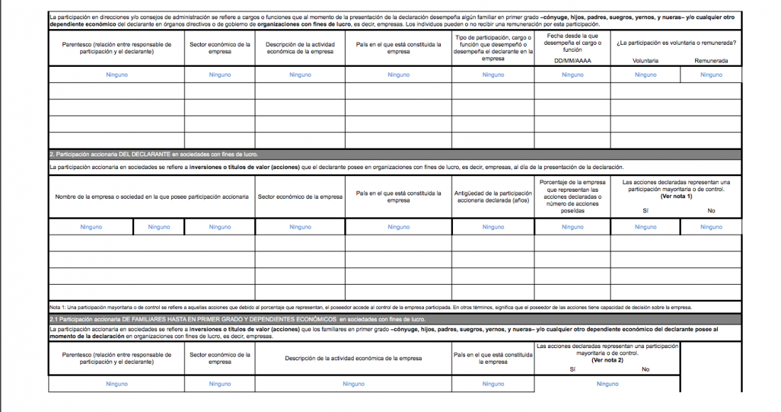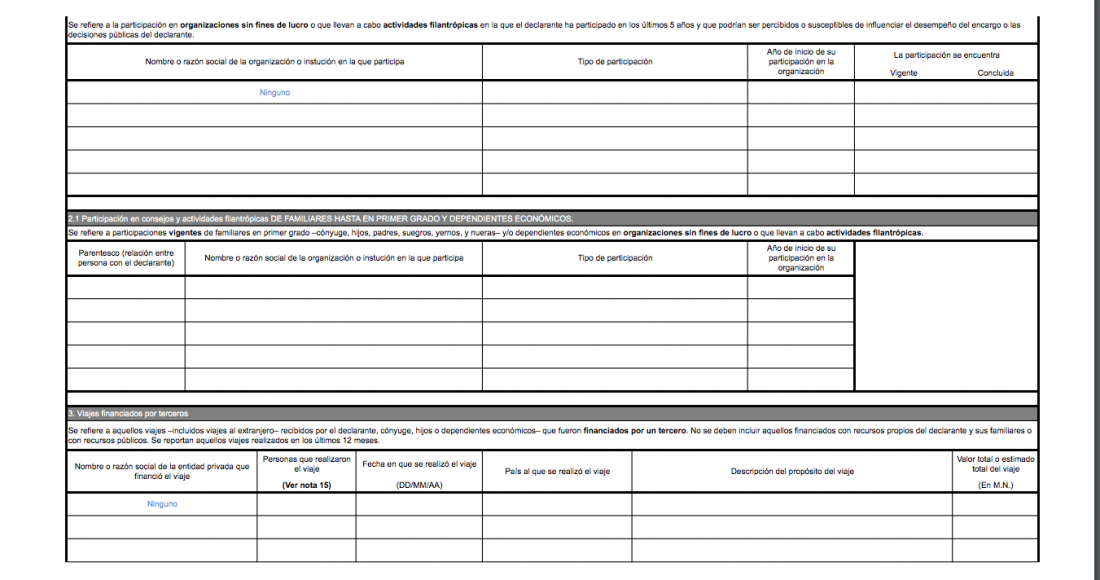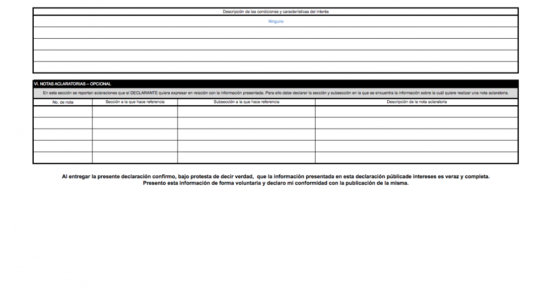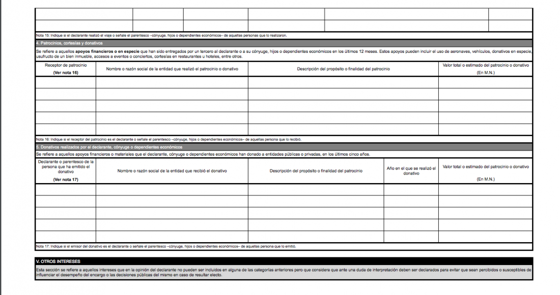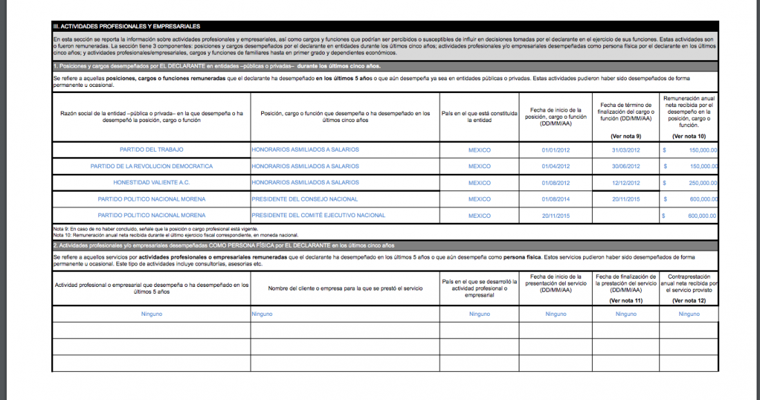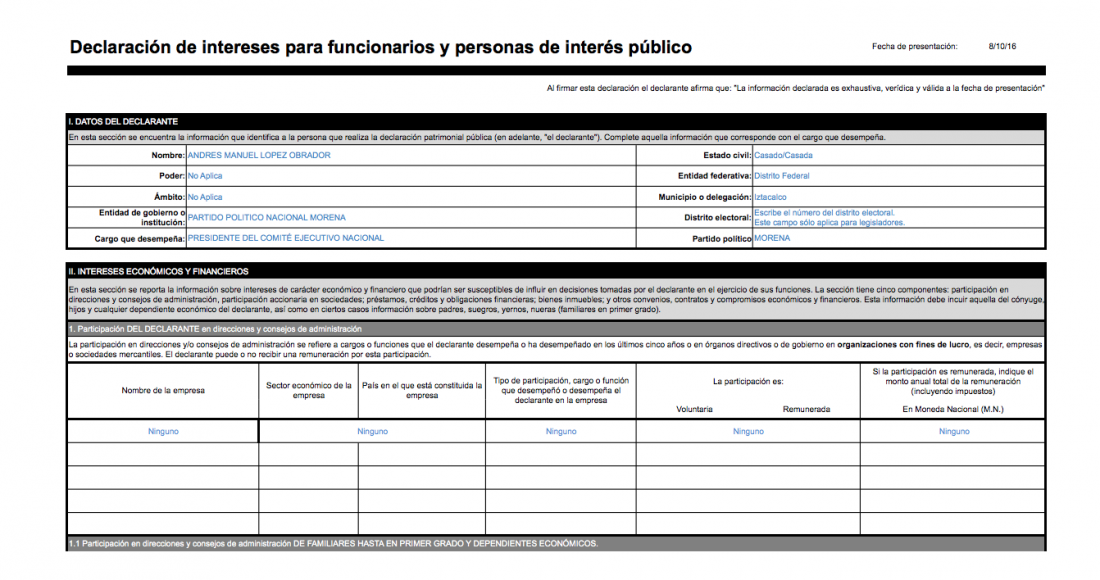 La gran ausencia son sus intereses. Estos, según los parámetros de Transparencia Internacional, son nombres de empresarios con los que en el pasado se hizo negocios. También, familiares o amigos. En caso de llegar al Gobierno un contrato con ellos podría significar un conflicto de interés. Pero Andrés Manuel López Obrador no menciona ningún nombre como “interés”, con excepción de su esposa, Beatriz Gutiérrez.