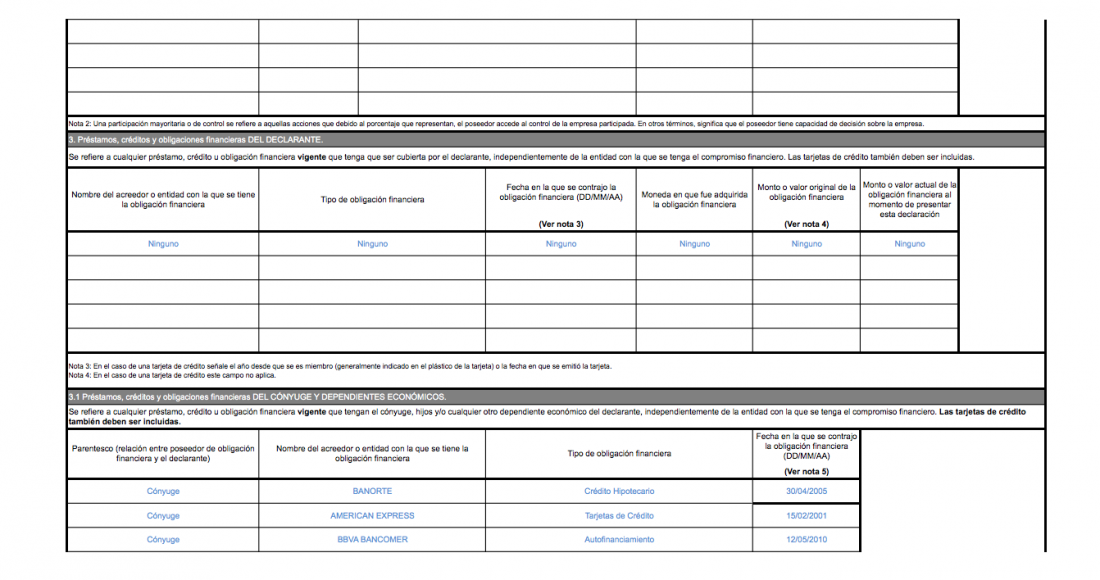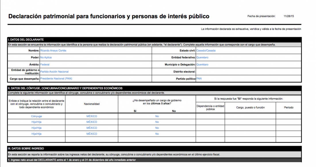 Andrés Manuel López Obrador y Ricardo Anaya Cortés no fueron funcionarios públicos en los pasados dos años. De modo que no tuvieron la obligación legal de presentar declaraciones patrimoniales. Ambos lo hicieron en la iniciativa ciudadana 3de3 cuyo formato pide bienes, intereses, además de impuestos. Meade Kuribreña era Secretario de Hacienda antes de ser ungido como precandidato único del Partido Revolucionario Institucional y debió presentar su declaración ante la Secretaría de la Función Pública al inicio de cada cargo que tuvo y en mayo de cada año.