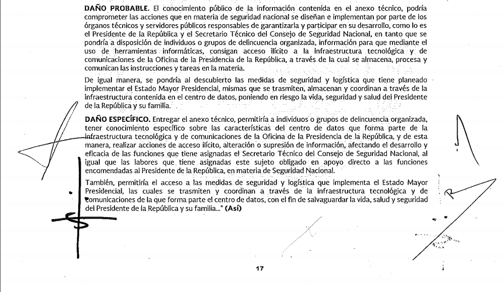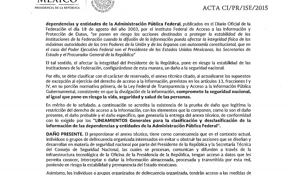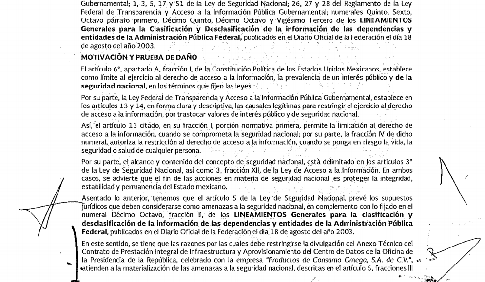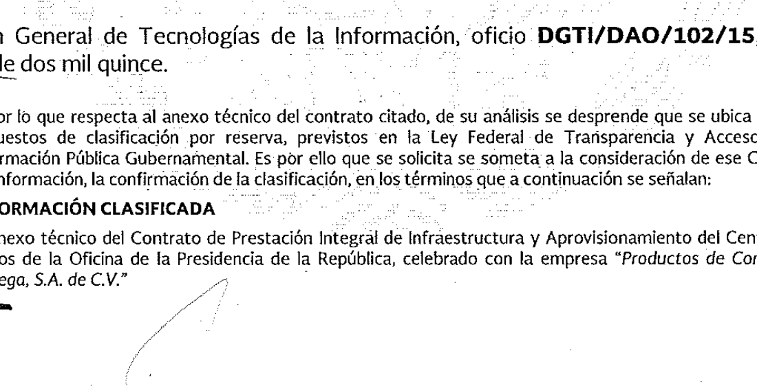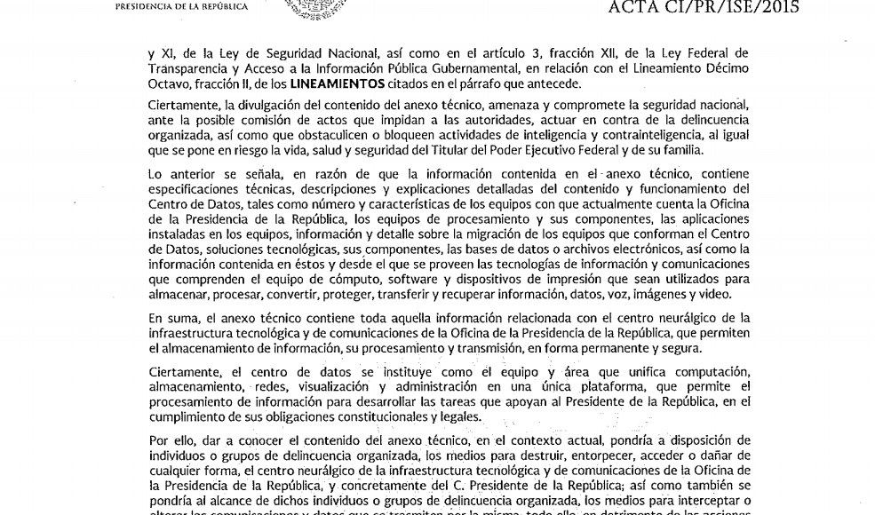El anexo técnico del contrato fue guardado con tres consideraciones. Una fue el daño al interés público de preservar la seguridad nacional y la salud, vida y seguridad de las personas, mediante la realización de diversas conductas que interfieran con la normal operación del centro de datos, según asentó la Dirección General de Tecnologías de la Información en el oficio DGT/DAO/102//15 enviado al Comité de Información de la Presidencia.