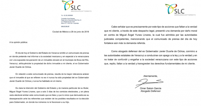 “El día de hoy el Gobierno del Estado de Veracruz emitió un comunicado de prensa en donde pretende mal informar a la sociedad mexicana y en especial a la veracruzana con una supuesta recuperación de un inmueble ubicado en el municipio de Boca del Río, Veracruz, atribuyéndole la propiedad de dicho inmueble a mi cliente, el ex Gobernador Javier Duarte de Ochoa”, precisó el abogado Omer Salom García.