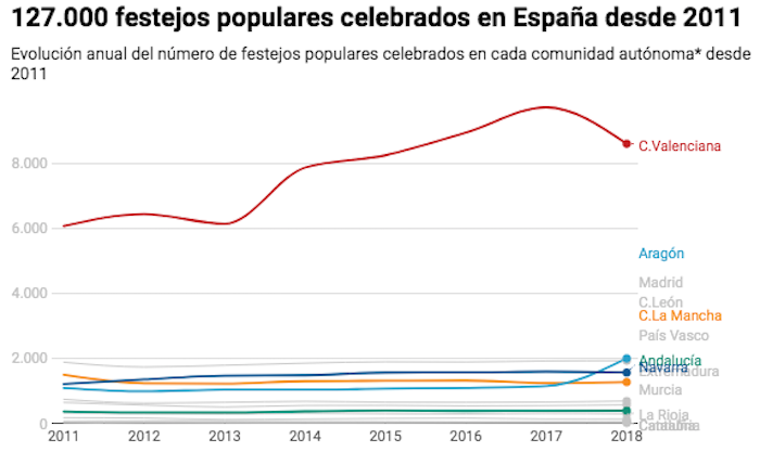 La comunidad autónoma más aficionada a estos festejos es, con mucho, la Valenciana. Cuadruplica a la siguiente que es Aragón. Y ha sido, precisamente esa comunidad la que centra la pérdida de festejos: mil 119 menos el curso pasado. Pasaron de 9 mil 715 a 8 mil 596 –por debajo incluso de 2016–, según el anuario del Ministerio.
