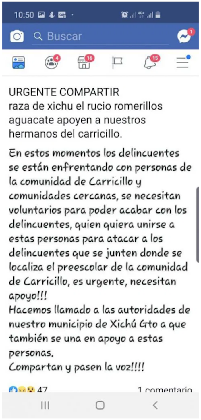 “Raza de Xichú, comunidades del Rucio, Romerillos, y Aguacate, apoyen a nuestros hermanos del Carricillo” .