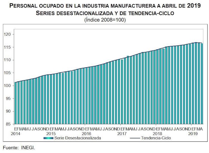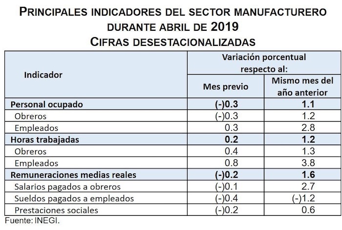 Ciudad de México, 18 de junio (Economía Hoy).- La cifra de personal ocupado en el sector manufacturero de México registró en abril de 2019 una disminución de 0.3 por ciento, con lo que liga dos meses con signo negativo y refuerza la tendencia a la baja que presenta desde el inicio del año, con cuatro meses de desaceleración iniciados en enero.