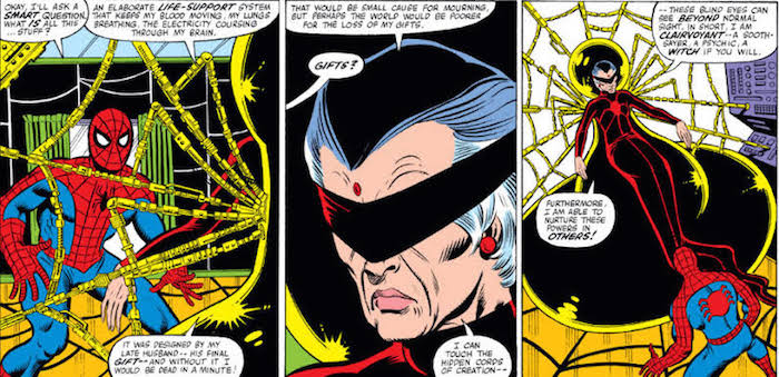En los cómics, Cassandra Webb padece una enfermedad neuromuscular que la deja paralizada y ciega, pero tiene poderes psíquicos como telepatía, clarividencia y premonición, lo que le permite conocer los eventos más allá de la capacidad de su cuerpo. Madame Web debe su nombre a la máquina de soporte vital a la que está conectada, similar a una telaraña gigante.