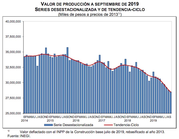En su comparación mensual, la caída fue significativamente más moderada, de 0.9 por ciento en septiembre frente a su nivel del mes inmediato anterior. Sin embargo, acumula ocho meses ininterrumpidos de caídas, desde febrero de 2019.