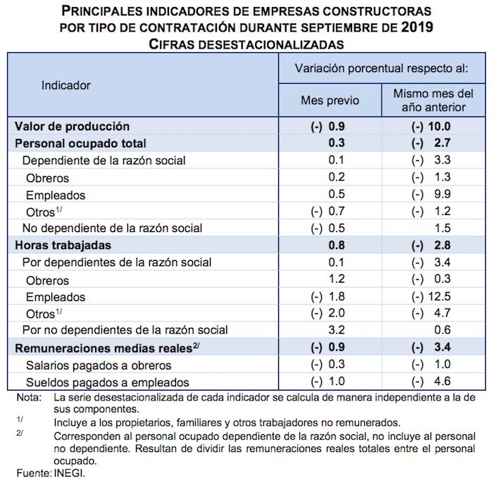 Ciudad de México, 22 de noviembre (Economía Hoy).- El valor de las empresas constructoras registró una contracción de 10.0 por ciento en septiembre, frente a su nivel del mismo mes de 2018, con lo que el sector construcción en México acumula 15 meses de caídas consecutivas a tasa anual.