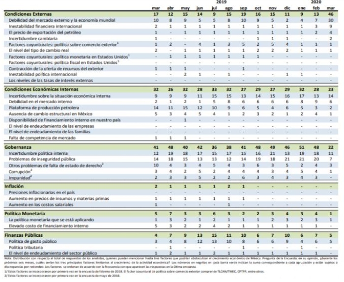 Desde hace un año, los analistas consultados por Banxico alertaron que la gobernanza era el mayor obstáculo para el crecimiento de la actividad económica, pero ante la pandemia de coronavirus los factores externos fueron la mayor preocupación con 33 puntos más que en febrero.