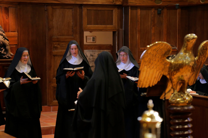 Las monjas, "unas expertas en confinamiento al ritmo del ora et labora, que ahora rezan por todos para salir del coronavirus", dedican ocho horas diarias a este rezo que ellas cantan íntegramente en latín y tardan un ciclo de tres años en dar toda la vuelta a un repertorio que nació hace cerca de mil 300 años.