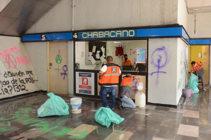 Dentro de las instalaciones del metro Chabacano, línea 2, un grupo de feministas se manifestaron realizando pintas y liberaron los torniquetes de acceso de la estación.