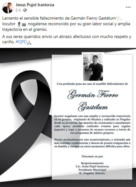 "Lamento el sensible fallecimiento de Germán Fierro Gastélum, locutor nogalense reconocido por su gran labor social y amplia trayectoria en el gremio. A sus seres queridos; envío un abrazo afectuoso con mucho respeto y cariño", se lee en el mensaje en Facebook.