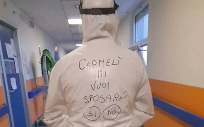 “Carmeli, ¿te quieres casar conmigo? Sí No”, se lee en la parte trasera del traje antiCOVID del enfermero.