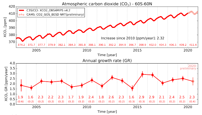 El análisis de los datos satelitales revela que las concentraciones de dióxido de carbono han seguido aumentando en 2020, alcanzando un máximo mundial sin precedentes en promedio de columnas de aproximadamente 413.1 ppm. La tasa de crecimiento media anual estimada de CO2 para 2020 fue de 2.3 +/- 0.4 ppm / año. Esto es menor que la tasa de crecimiento en 2019, que fue de 2.5 +/- 0.2 ppm / año y también menor que el aumento de 2.9 ppm / año en 2015 y 2016. Sin embargo, 2015 y 2016 experimentaron un fuerte evento climático de El Niño, que resultó en un mayor tasa de crecimiento atmosférico debido a una absorción más débil de lo normal de CO2 atmosférico por la vegetación terrestre y grandes emisiones de incendios forestales, particularmente en Indonesia en aquellos años.