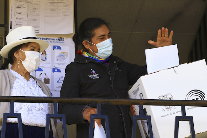 Yaku Pérez, candidata presidencial en representación del partido indígena Pachakutik, emitió su voto. Foto: AP/Marcelo Suquilanda