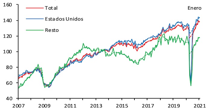 En enero de 2021 las exportaciones petroleras mostraron un avance con series ajustadas por estacionalidad derivado tanto de un mayor valor de las exportaciones de petróleo crudo, como de las de otros productos distintos de petróleo crudo.