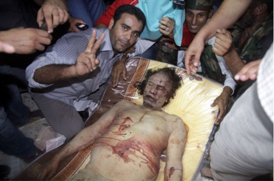 Tras meses de asedio de los rebeldes de Libia y de ataques de la coalición militar de la OTAN, Muamar Gadafi, fue capturado en Sirte, su ciudad natal, mientras intentaba huir a Misurata. El ex dictador, al ser capturado, padeció la ira desboradada de su pueblo y con esto la rebelión terminó con 40 años de dictadura. No obstante, las manifestaciones de desprecio que sufrió el cadáver de Gadafi fueron condenadas y celebradas al mismo tiempo. Feron muchas las imágenes que circiularon en internet con rebeldes posando junto a los restos del ex líder libio como si se trara de un trofeo de caza.