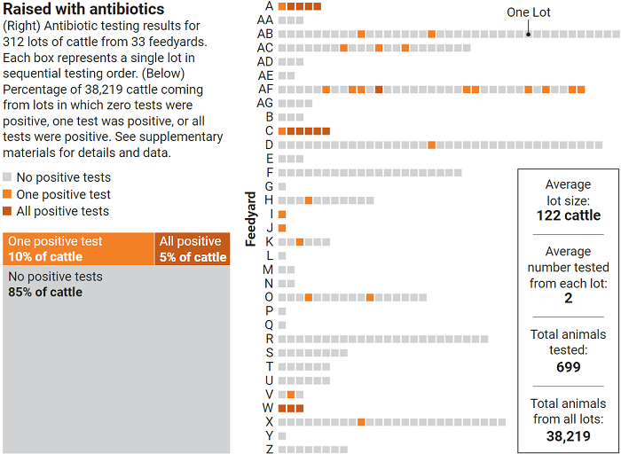 Descubrieron que el 42 por ciento de los corrales de engorde tenían al menos un animal con resultados positivos. Los lotes con al menos una prueba positiva representaban aproximadamente el 15 por ciento del ganado "criado sin antibióticos".