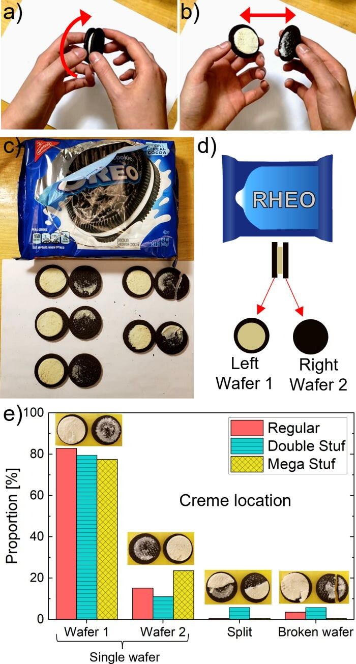 El estudio realizado por un equipo del Instituto Tecnológico de Massachusetts (MIT) caracterizó el flujo y la fractura de las galletas y vieron que la crema, cuya textura reológica es oficialmente "blanda", tiende a pegarse a un lado de la galleta.