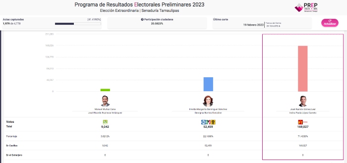 Ciudad de México, 19 de febrero (SinEmbargo).-- José Ramón Gómez Leal, de la alianza entre Morena y el Partido del Trabajo (PT), sería el ganador de la elección extraordinaria de una senaduría en Tamaulipas, según los resultados preeliminares del conteo de votos, que hasta las 22:30 horas ya juntaban el 73 por ciento de la votación.