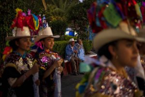 Abel Aguilar, en el centro a la izquierda, asiste a la celebración que conmemora el nacimiento del volcán Paricutín, en San Juan Nuevo Parangaricutiro, México, el lunes 20 de febrero de 2023. Aguilar tenía cinco años cuando el Paricutín entró en erupción por primera vez y fue junto con otros niños a “a ver caminar la lava, así, de a poquito”, dijo. Foto: Eduardo Verdugo, AP.