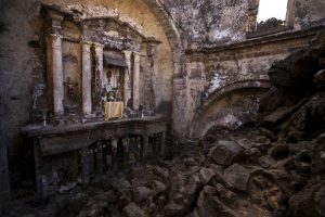 Un altar, adornado con reliquias religiosas, permanece visible dentro de la iglesia enterrada décadas atrás por la lava del volcán Paricutín, en San Juan Parangaricutiro, México, el martes 21 de febrero de 2023. La lava del Paricutín cubrió 18.5 kilómetros cuadrados. Su lento avance permitió a los residentes de las comunidades cercanas trasladarse a otras zonas donadas por el Gobierno. Foto: Eduardo Verdugo, AP.