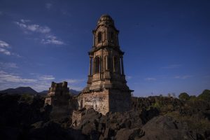 La torre de una iglesia sobresale por encima de la lava del volcán Paricutín que enterró la iglesia hace décadas, en San Juan Parangaricutiro, en México, el martes 21 de febrero de 2023. Foto: Eduardo Verdugo, AP.